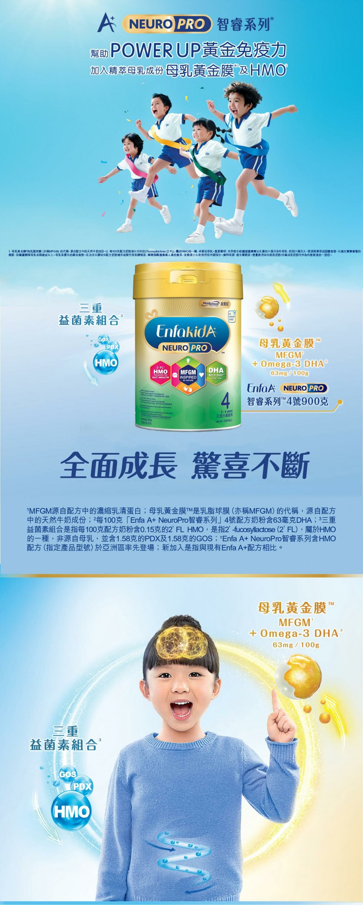 New Mead Johnson Enfa A+ NeuroPro S4 is added with MFGM*, DHA(63mg/100g), triple prebiotics with 2’-FL** HMO, PDX &, GOS, and other nutrients. Upgraded formula supports brain development, can help improve gastrointestinal health and enhance immunity. It supports holistic child development and hel