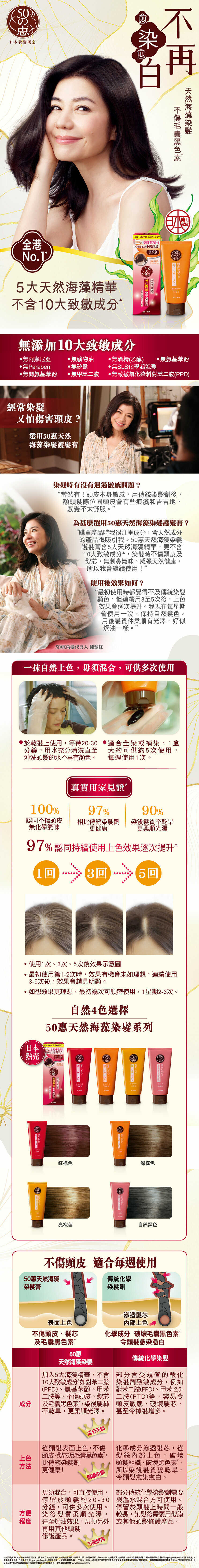 傳統染髮劑較刺激及傷害頭皮,經常使用容易令頭髮變得乾旱無光澤,頭皮敏感,甚至掉髮增多。日本50惠天然海藻染髮護髮膏,5大天然海藻精華,不含10大致敏成份,不傷頭皮及髮芯,適合每星期使用一次,保持均勻亮麗髮色。