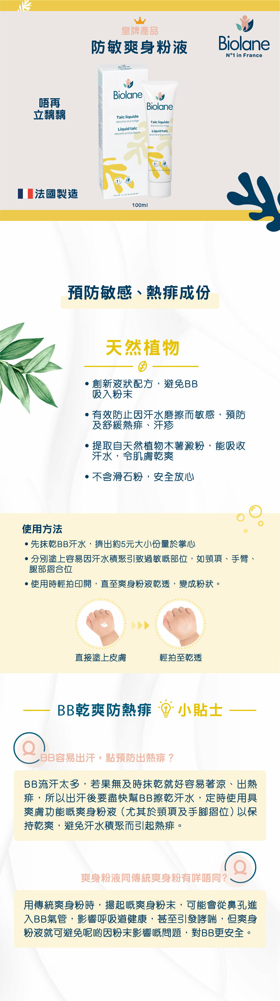 The innovative liquid talcum powder is not easy to cause dust sensitivity, but also can keep the baby's skin dry and prevent the baby's red buttocks. The natural ingredients-corn flour and wheat air care are carefully selected, which can be used every day!