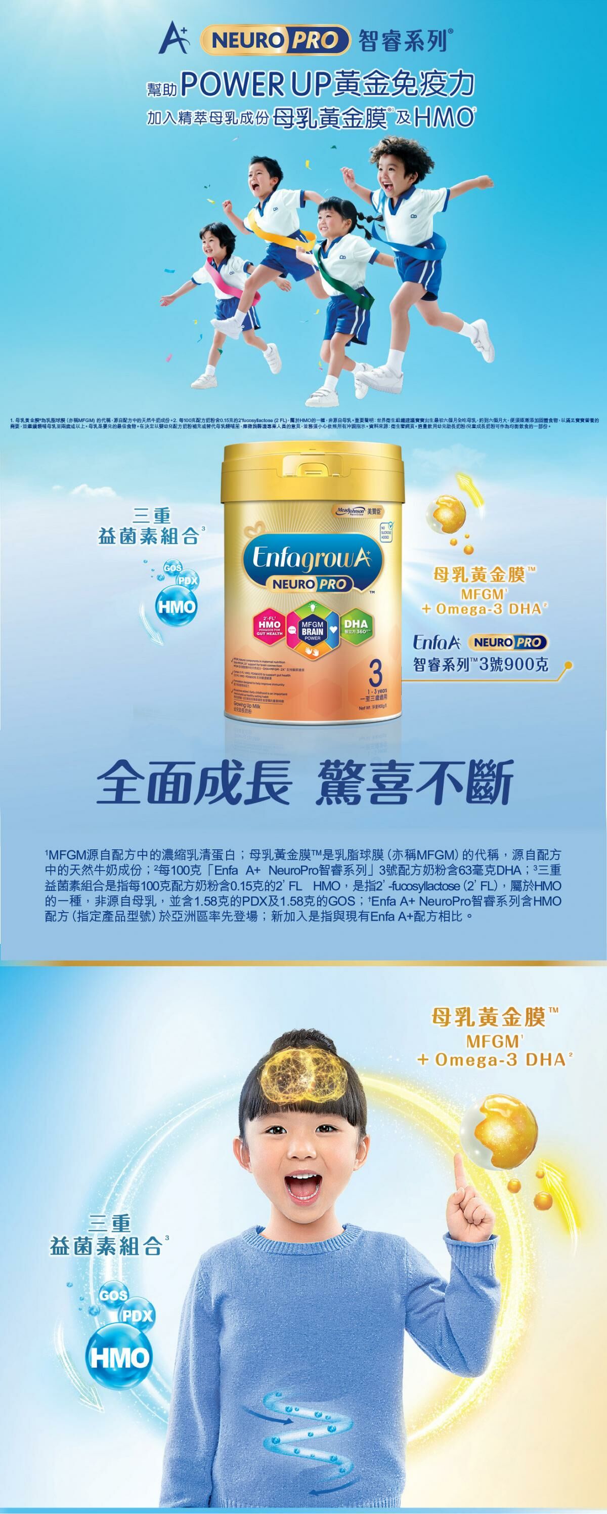 全新美贊臣 Enfa A+ NeuroPro智睿系列 3號含有母乳黃金膜MFGM*和DHA、三重益菌素组合2’-FL** HMO、PDX &, GOS及其他多元營養素。升級配方支持腦部發育,有助腸道健康及提高免疫力,幫助寶寶全面發展,開啟無限潛能。