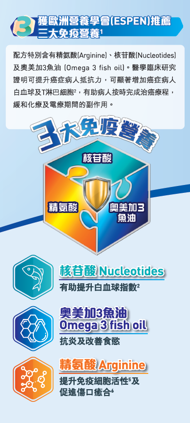 •獨特免疫營養配方 – 含精氨酸、核苷酸及奧美加3魚油